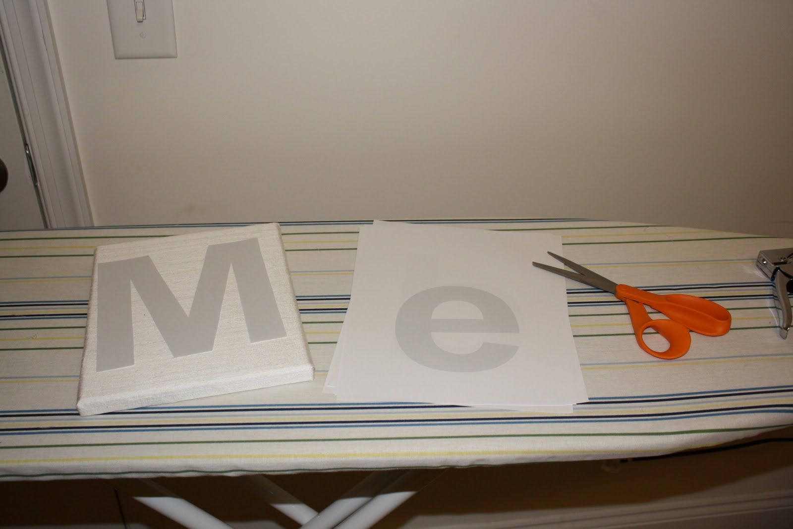*You’ll attach the letters to your canvas temporarily with the tiny sewing pins. This is so that when you trace them, they won’t move and cause you a massive headache! I DID measure when it came to this part. I wanted to make sure that the letter was centered and not lopsided. Next, I traced lightly around the letter with a pencil. You might have to use a pen or one of those chalky pencils from the sewing store if you are using a patterned or darker fabric that pencil won’t show up on. Since I was using white silk, pencil was the easiest way to go. Don’t worry, marks will be left behind, but you’ll cover them with buttons and brads.