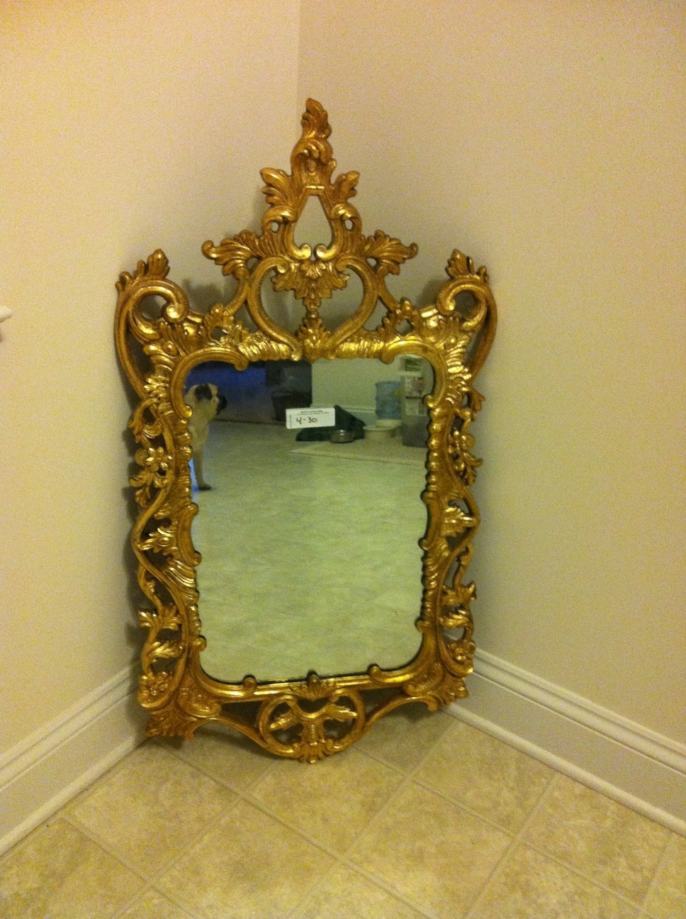 But, on to our trip to New Jersey. We had to go to pick up the dresser for our Baby Girl’s nursery that I blogged about a week and a half ago. After making several wrong turns, and getting turned around in the little town the shop is located in…we found the store and got to see the dresser for the first time. I LOVE IT! It was even better in person! The store was really neat too. While walking around the little town, we found THE mirror. And I say THE mirror because it flat out called my name. Haha! You all know I’m going for a peacock color scheme for the nursery and I’ve been looking for something gold to tie into the room. And Bam! Here it is:
